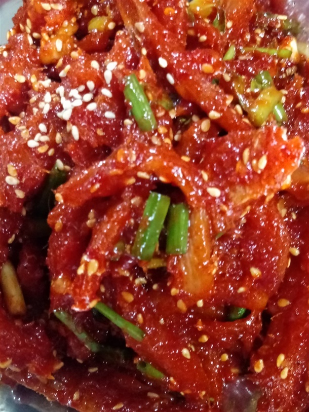 | 원재료 함량 | 양념젓갈(명태:러시아)79%, 절임식품(무말랭이:중국산)5%, 도라지뿌리(중국산)5%,고춧가루5%,물엿3%,다진마늘,생강,설탕,발효식품,참기름,고추장,L-글루탐산나트륨,볶은참깨,조미액젓 |